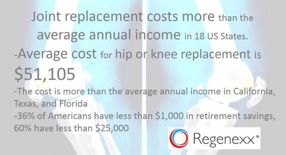 The writer looked at the average cost of a knee or hip replacement and compared that whopper $50,105 cost to the average income in all 50 states. She also adjusted that mean cost of the surgery by state. 18 US states had knee or hip replacement costs that exceeded their average annual income. Perhaps more disturbing is that 7 in 10 Americans don’t have enough saved to cover the cost in retirement. Even if the surgery is covered by a solvent Medicare program, the 20% out of pocket costs would completely or substantially drain the life savings of 60% of Americans. Is it time for less a invasive knee replacement alternative?