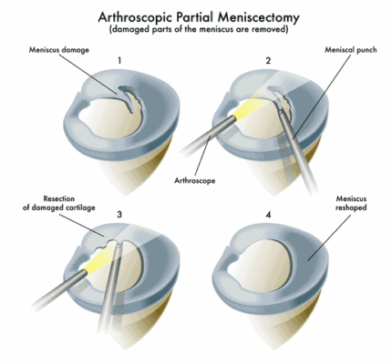 - Partial meniscectomy: The removal of the damaged portion of the meniscus.