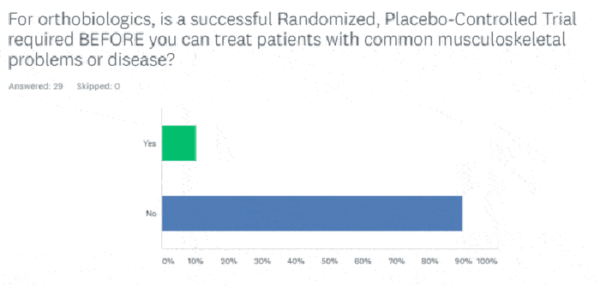 The answer to this first question says it all, 90% of physicians actually using orthobiologics don’t believe they need level 1 evidence to use the stuff. That’s in direct contradiction to the university talking heads that show up in these stories. Why the disconnect? I suspect that our quote above applies. If you’re in the trenches treating patients you have a different view about evidence than someone who lives in an Ivory Tower.