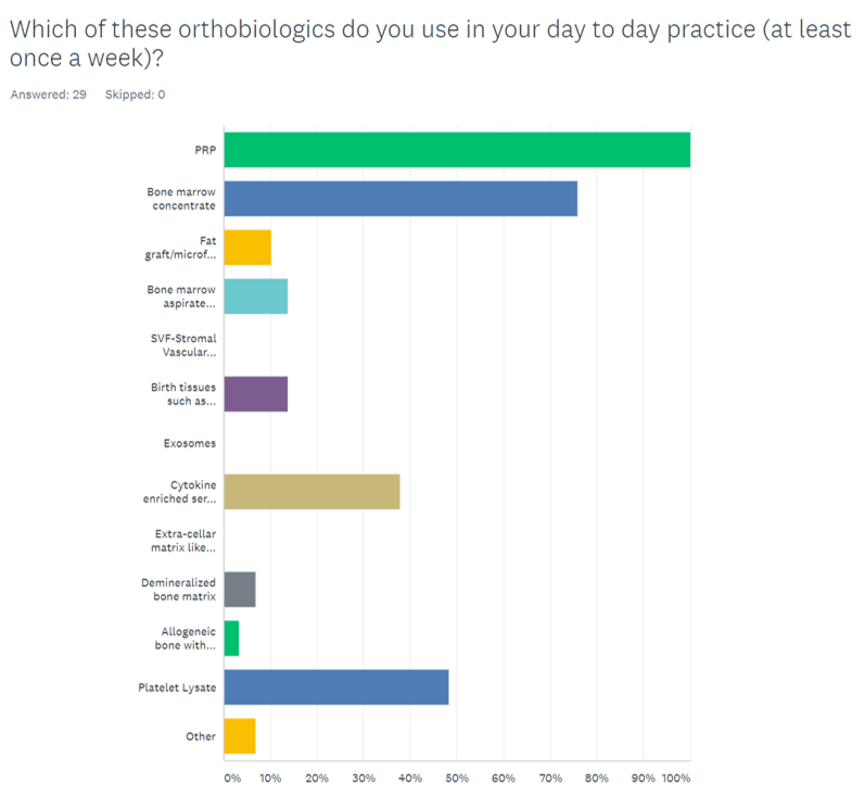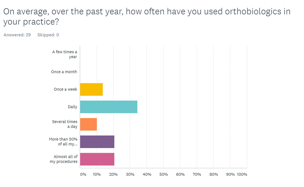 Here, about a third of doctors use orthobiologics daily. However, adding up the bottom two categories, we have 40% who use them very frequently (more than half of their entire practice). Under 14% use them less than daily and a whopping 86% use them at least daily!