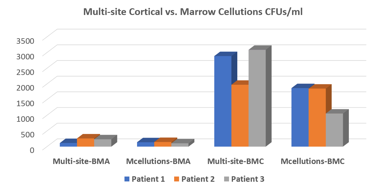 For this white paper, the authors compared the MC device on one side of the pelvis to a large-volume draw on the other side. This is not an apples-to-apples comparison, as you now know that if we draw larger volumes of marrow, we get fewer stem cells. The MC device makes you draw smaller volumes from more sites; hence, we would expect more stem cells per unit volume. This is what this advertising white paper found. Again, what should have been done was to compare the MC device to the other side with the same small volumes being taken from multiple sites.
