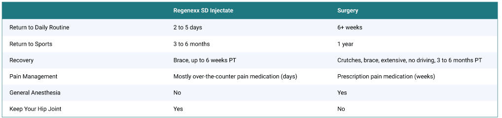 By delivering these customized concentrations directly to the site of injury, the Regenexx approach may help stabilize the hip joint, improve function, and enhance mobility. These procedures provide a minimally invasive alternative to surgery and may help support long-term joint health.