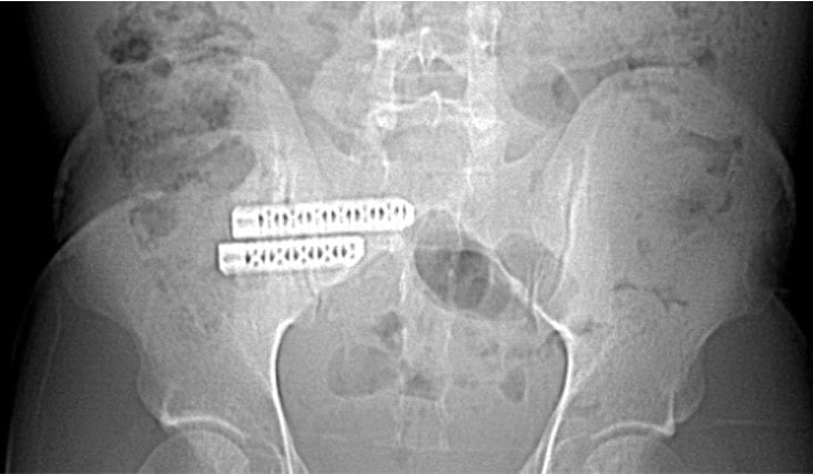 The two large screws visible on the left pass through the SI joint into the sacrum. While this fusion stabilizes the joint, it also eliminates its natural movement. The SI joint is designed to absorb and distribute energy, and this functionality is lost after fusion. As a result, the energy that would typically dissipate through the SI joint is redirected elsewhere in the pelvic region.