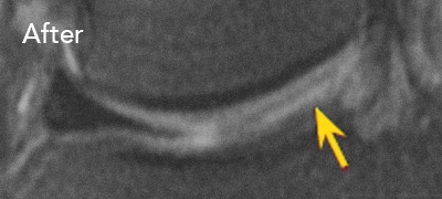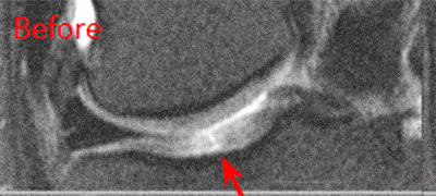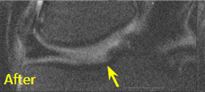 Below are the outcomes of two patients with Regenexx protocol done for knee osteoarthritis. Scroll the arrow to the right to see the MRI of the knee joint before their treatment — the white/ lighter area indicates damage. Scroll to the left to see the MRI of the knee joint after their treatment.