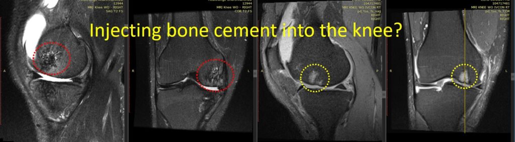 A patient pursued stem cell treatment for knee arthritis after complications from a prior subchondroplasty. During an initial bone cement injection into BMLs, the surgeon, performing the procedure for the first time, unintentionally worsened the condition.